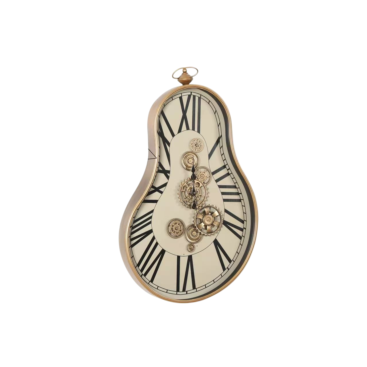 Ceasul de perete model E207 este o piesă decorativă spectaculoasă, ideală pentru interioare moderne și elegante. Designul său iese în evidență prin forma neregulată, cifrele romane clasice și mecanismul cu roți dințate vizibile, care adaugă un efect dinamic și rafinat.