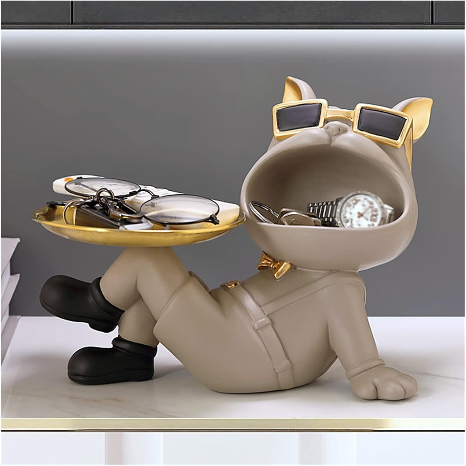 Adăugați un strop de eleganță și funcționalitate cu Decoratiunea 5001 .Această statuie elegantă în formă de câine, dotată cu o tava aurie, este ideală pentru a aduce un accent sofisticat în sufragerie, pe masă sau în birou. Utilizați-o pentru a păstra bomboane, bijuterii, chei sau alte obiecte mici, economisind spațiu și aducând un plus de stil. Cu dimensiuni de 27,8 x 20,5 cm, decoratiunea este și un cadou minunat pentru cei dragi.