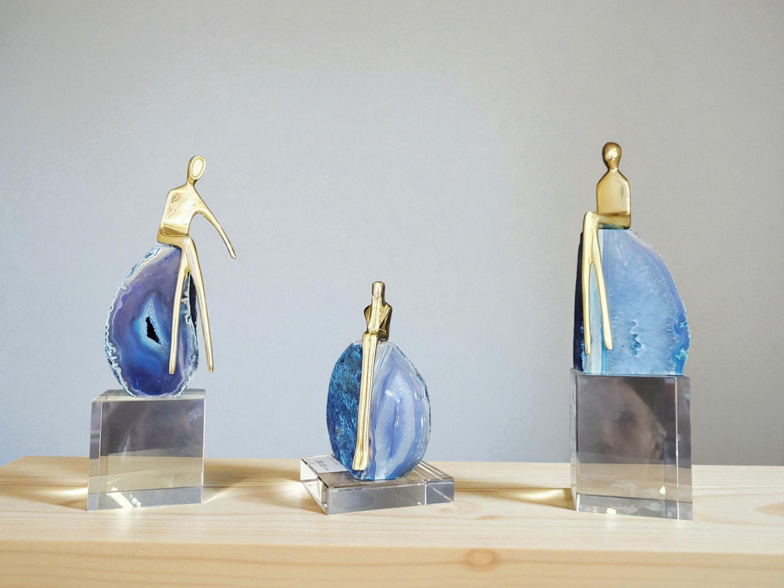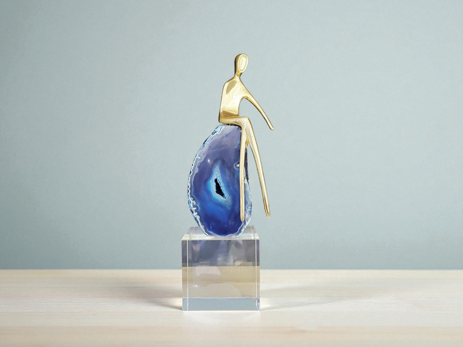 Decoratiunea CX002 este o piesă modernă și artistică, creată pentru a aduce personalitate și eleganță oricărui spațiu. Fiecare model este realizat din piatră naturală de agat albastru, cu structuri unice, completată de o figură metalică aurie stilizată și un suport transparent care pune în valoare întreaga compoziție.