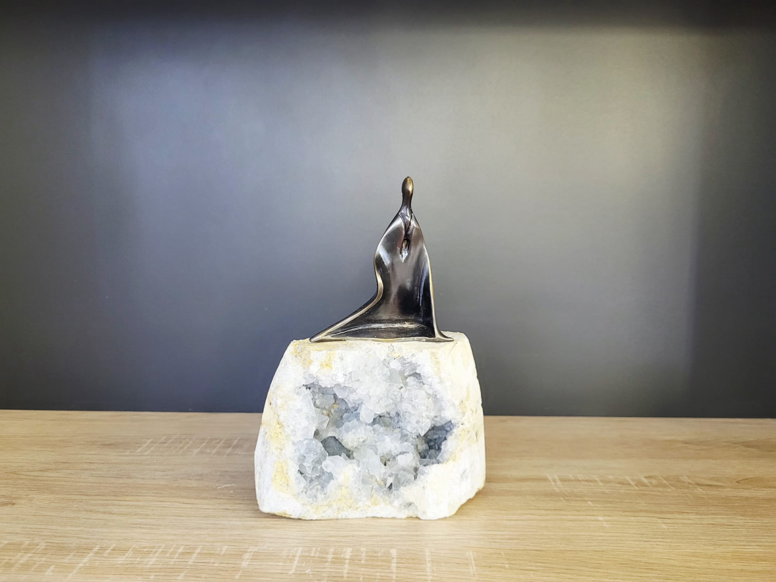 Această statuetă decorativă îmbină armonios elemente naturale și design artistic. Baza este o rocă autentică cu cristale de celestină și cuarț, care oferă textură și reflexii subtile ale luminii. Deasupra se ridică o sculptură metalică abstractă, cu linii fluide și o formă curbată ce sugerează un vârf ascendent sau o mantie plutitoare. Finisajul metalic auriu–aramiu are un luciu moderat, punând în valoare contrastul între metalul șlefuit și structura brută a pietrei.Piesa decorativa este disponibila in trei variante .