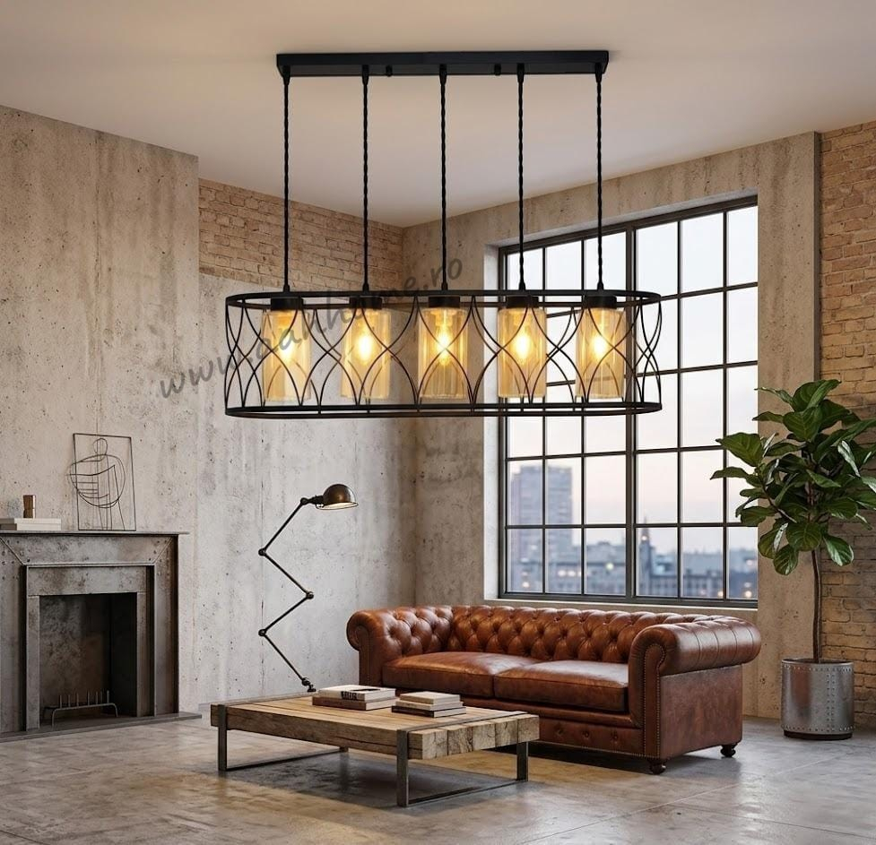 Lustra model 2337/5 este un corp de iluminat suspendat cu un design industrial-chic elegant, ideal pentru spațiile moderne care îmbină elemente brute cu accente sofisticate. Realizată din metal finisat în negru mat și completată de abajururi cilindrice din sticlă ambră transparentă, această piesă oferă un echilibru perfect între funcționalitate și estetică decorativă.