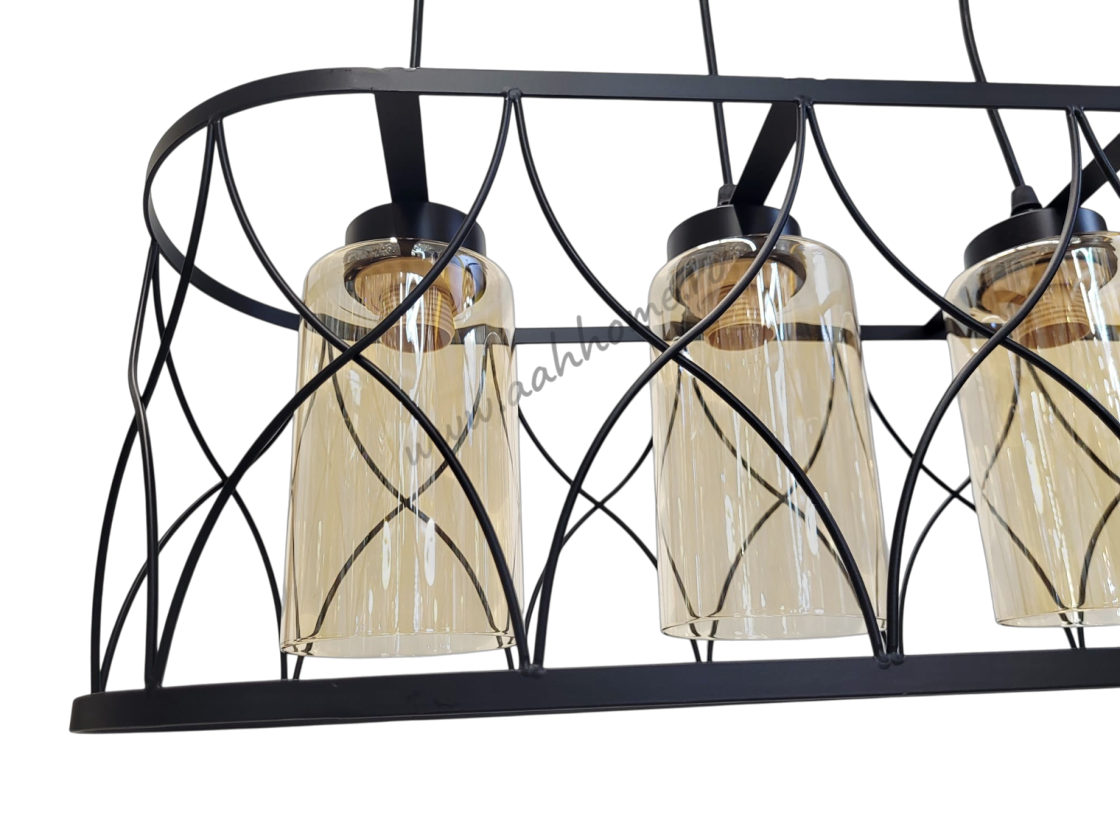 Structura sa este definită de un cadru metalic dreptunghiular, cu colțuri rotunjite, decorat cu un model tip plasă format din linii curbe intersectate, ce creează un efect vizual dinamic și rafinat. În interiorul acestui cadru sunt dispuse 5 abajururi cilindrice din sticlă, care difuzează o lumină caldă, plăcută și relaxantă, ideală pentru zonele de dining sau bucătărie.