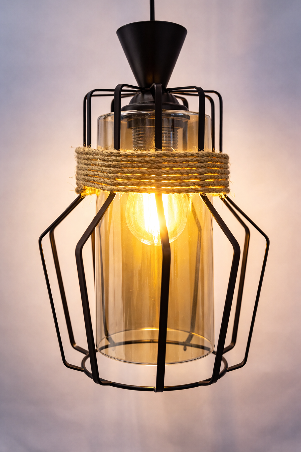 Cadru metal negru, abajur sticlă aurie și sfoară decorativă.