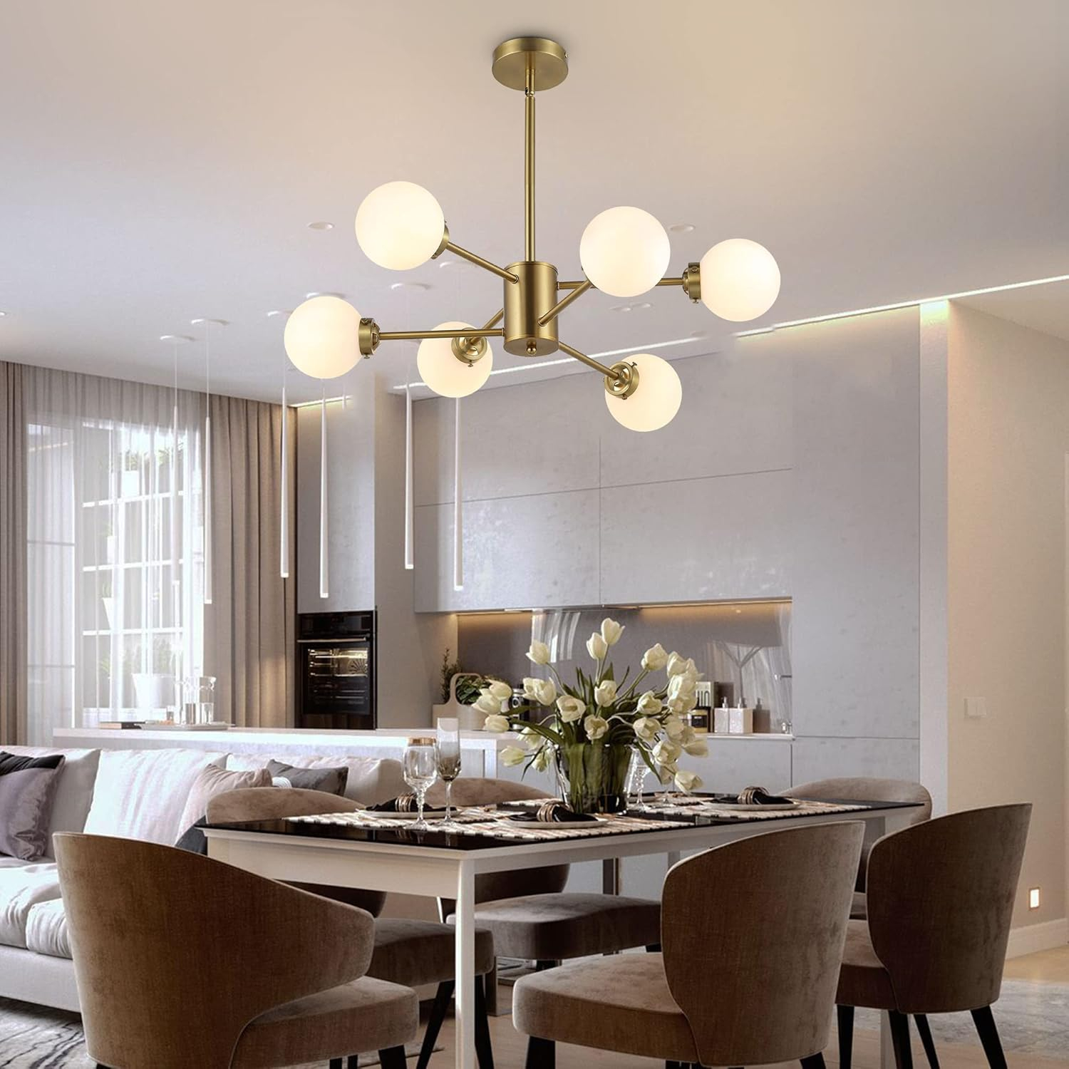 Lustra este realizată din metal auriu și globuri din sticlă albă mată.
