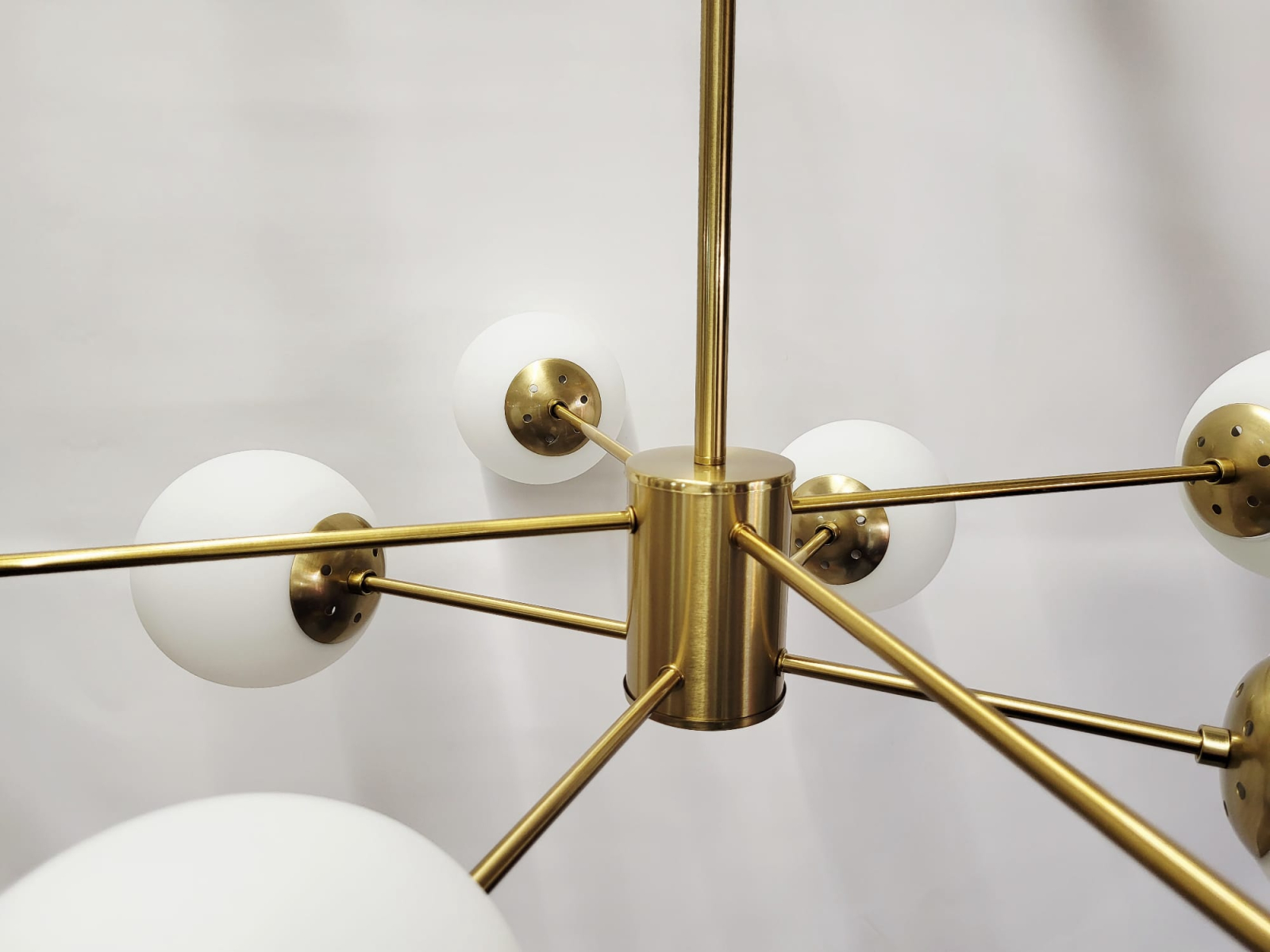 Lustra este realizată din metal auriu și globuri din sticlă albă mată.