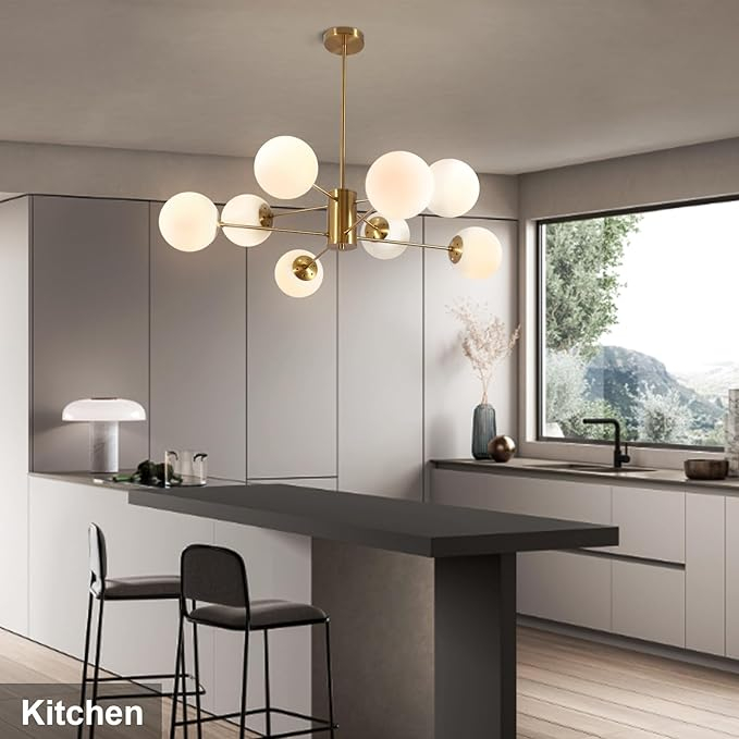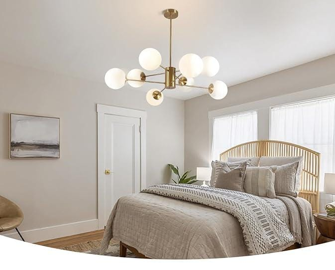 Realizată din metal de înaltă calitate, cu finisaj auriu și globuri din sticlă albă mată, această lustra se integrează ușor în orice decor, fiind potrivită pentru camere de zi, dormitoare sau birouri.