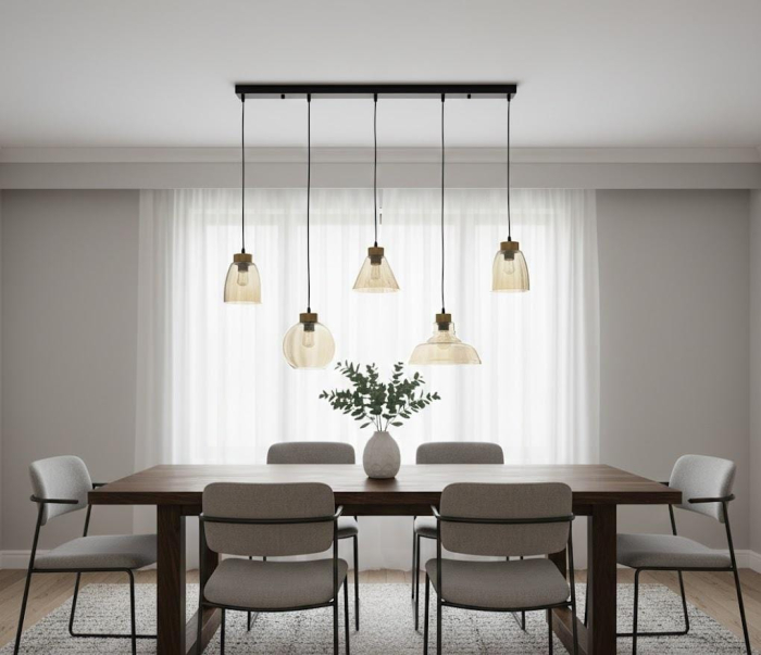 Lustra model 2371/5 este un corp de iluminat decorativ cu design modern și influențe industriale, conceput pentru a aduce eleganță și personalitate spațiilor interioare. Este echipată cu cinci abajururi din sticlă aurie, fiecare având o formă distinctă – sferică, conică sau bombată – care creează un joc vizual echilibrat și rafinat.