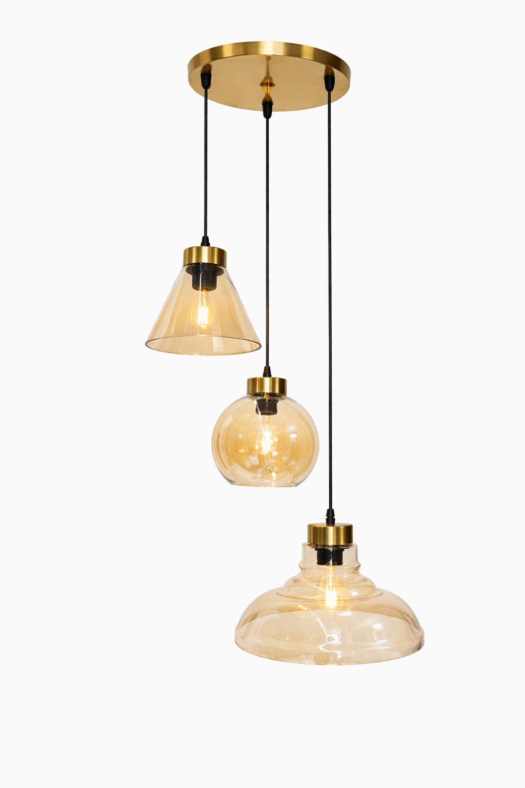 Lustra suspendată 2371/3 impresionează printr-un design elegant și modern, fiind realizată din metal auriu și echipată cu trei globuri din sticlă în nuanță amber (aurie), fiecare având o formă distinctă. Această combinație creează un efect vizual rafinat și o lumină caldă, ambientală.
