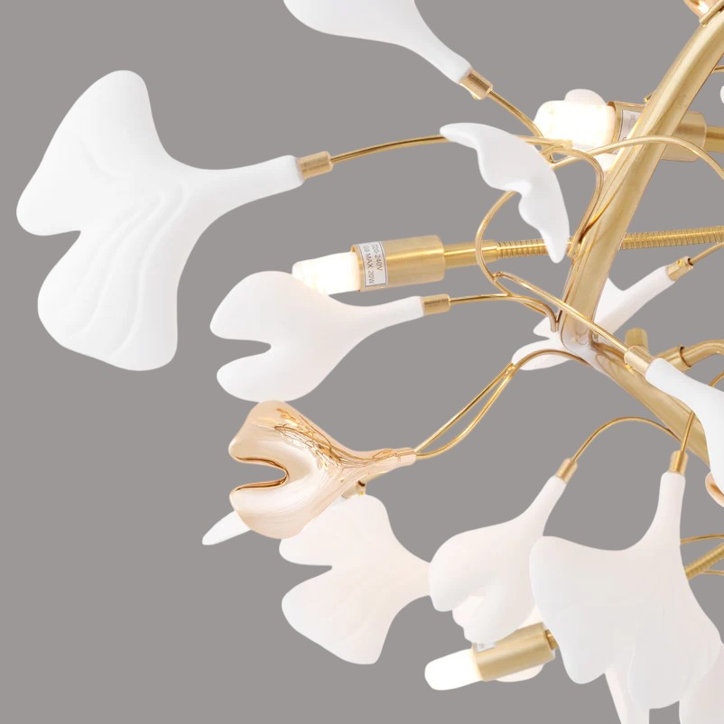 Structura este realizată din metal cu finisaj auriu, modelat sub forma unor crengi stilizate, care susțin petale decorative din plastic alb și metal auriu. Aceste detalii subtile creează un efect luminos plăcut și echilibrat, punând în valoare atât lumina, cât și volumul lustrei.