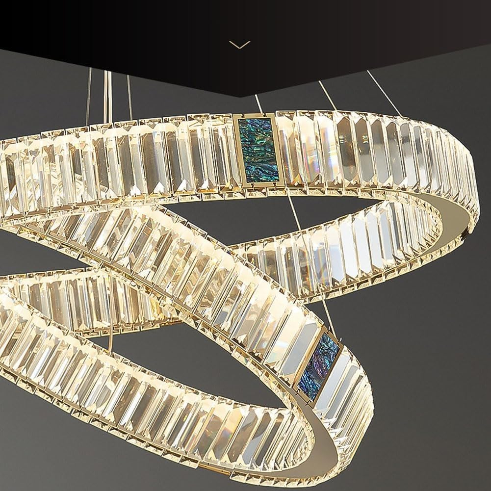 Lustra BO 1009/50+70 este o piesă de iluminat modernă, concepută pentru a îmbina estetica elegantă cu funcționalitatea practică. Realizată din metal de calitate și sticlă ce imită perfect cristalul, această lustră oferă un efect vizual spectaculos datorită celor două inele suspendate, cu diametre de 70 cm și 50 cm.