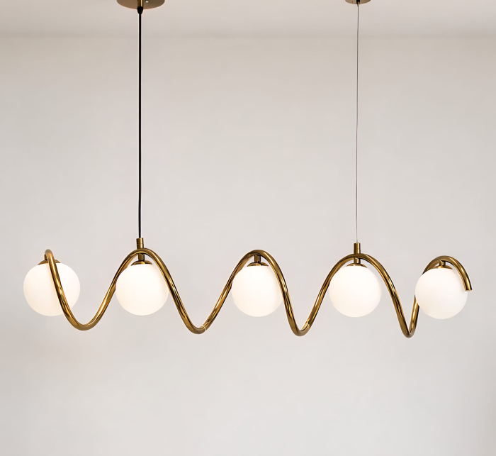 Lustra moderna cu design elegant si forma ondulata, realizata din metal cu finisaj auriu si cinci globuri din sticla alba mata. Modelul ofera un aspect decorativ deosebit si se potriveste perfect in living, dining, bucatarie sau alte spatii amenajate in stil modern sau contemporan.