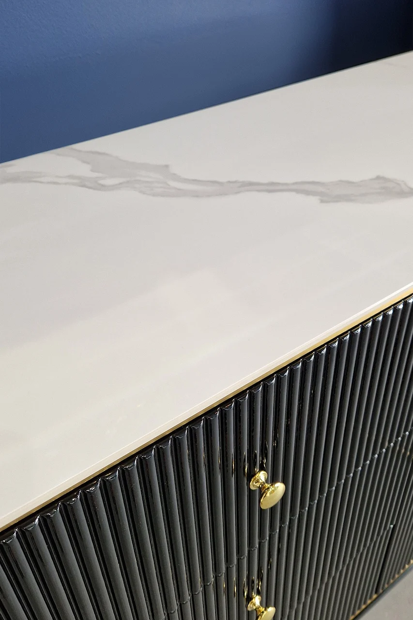 Disponibil în două variante de culoare – alb sau negru – cabinetul se adaptează cu ușurință diferitelor stiluri de amenajare, de la modern minimalist până la glam contemporan. Blatul din marmură compozită albă, cu discrete detalii negre, completează armonios aspectul elegant și oferă un contrast subtil cu structura mobilierului.