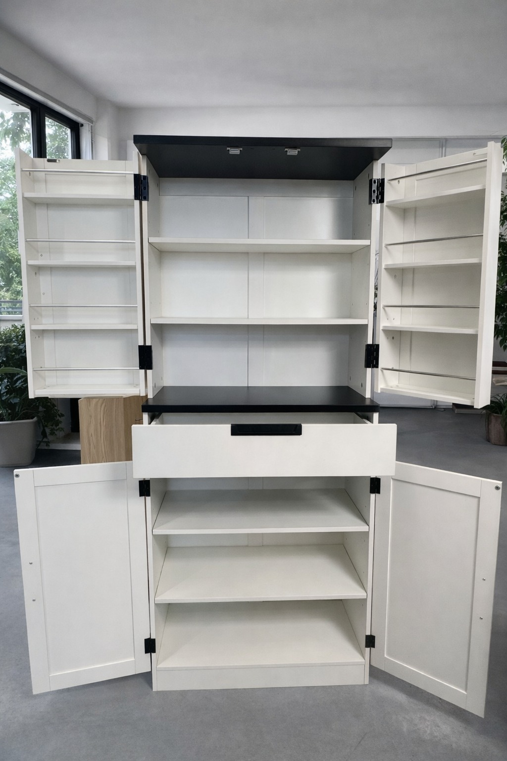 Dulapul dispune de 6 rafturi interioare, 8 rafturi pe uși și un sertar mare central.