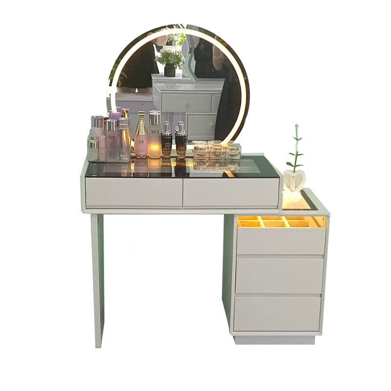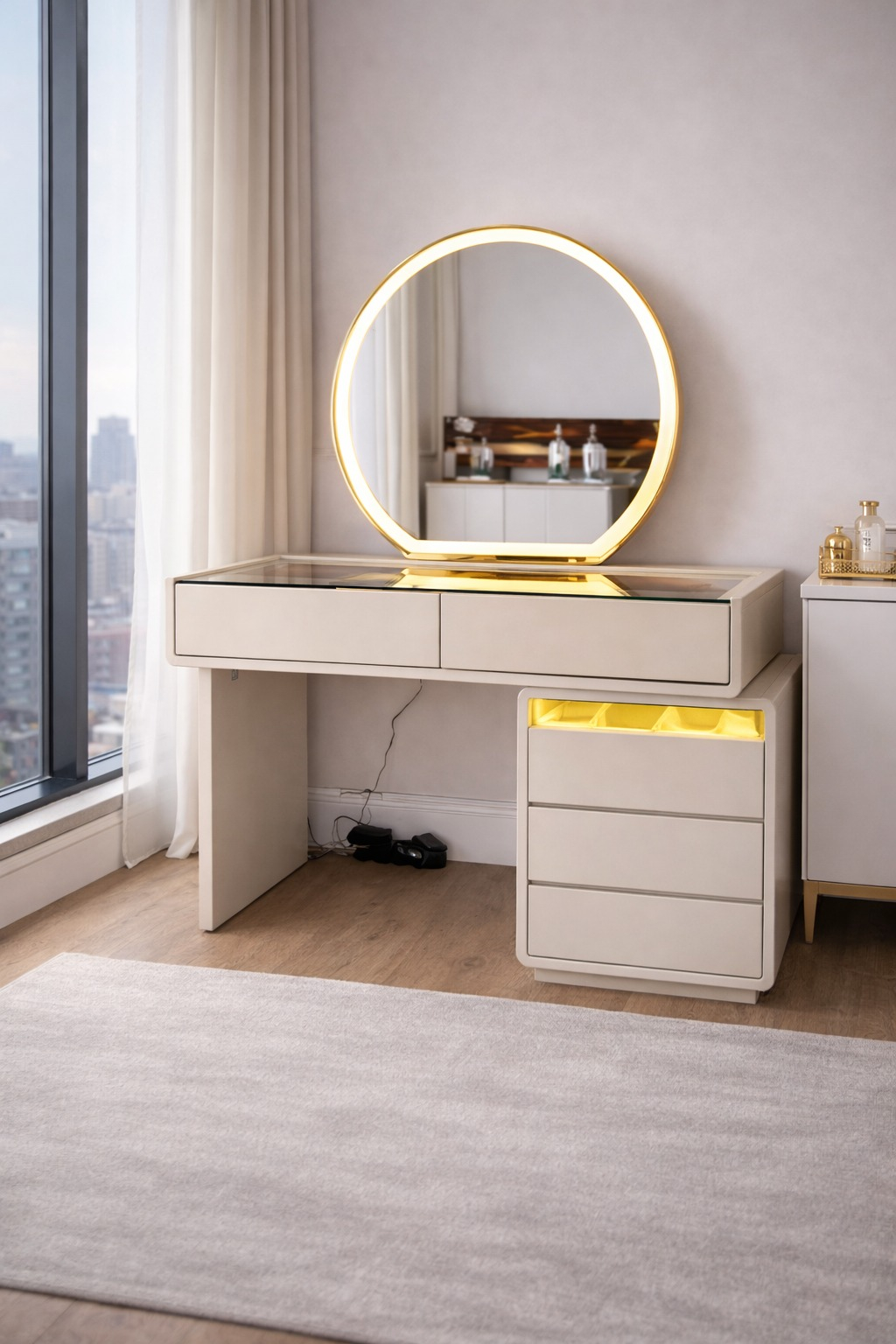 Masa este prevăzută cu oglindă rotundă încorporată, echipată cu iluminare LED integrată în trei variante de culoare, adaptabile în funcție de preferințe sau de momentul zilei. Sistemul de control tactil permite schimbarea tipului de lumină și reglarea intensității, asigurând o vizibilitate optimă pentru aplicarea machiajului.