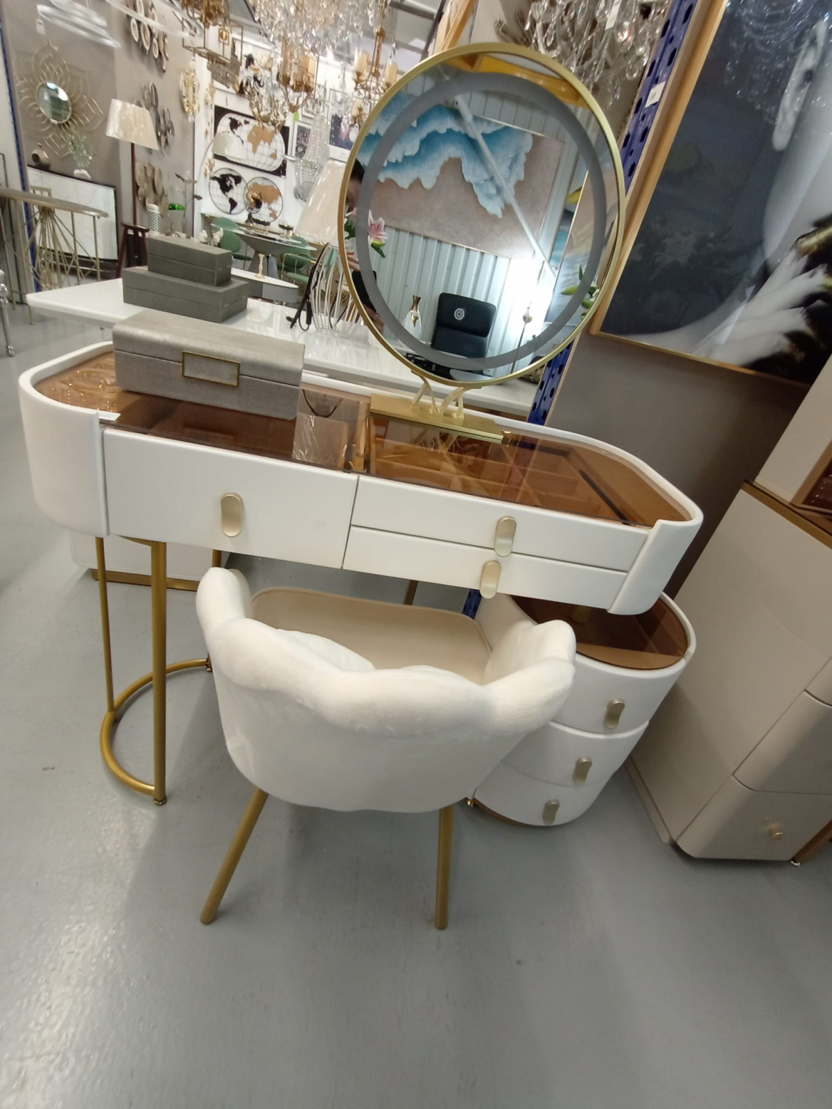 Cu un blat de sticlă transparentă, această măsuță de toaletă emană un aspect glamour și modern. Conținutul pachetului include masa de toaletă cu sertare,oglinda, dulapul lateral și scaunul.