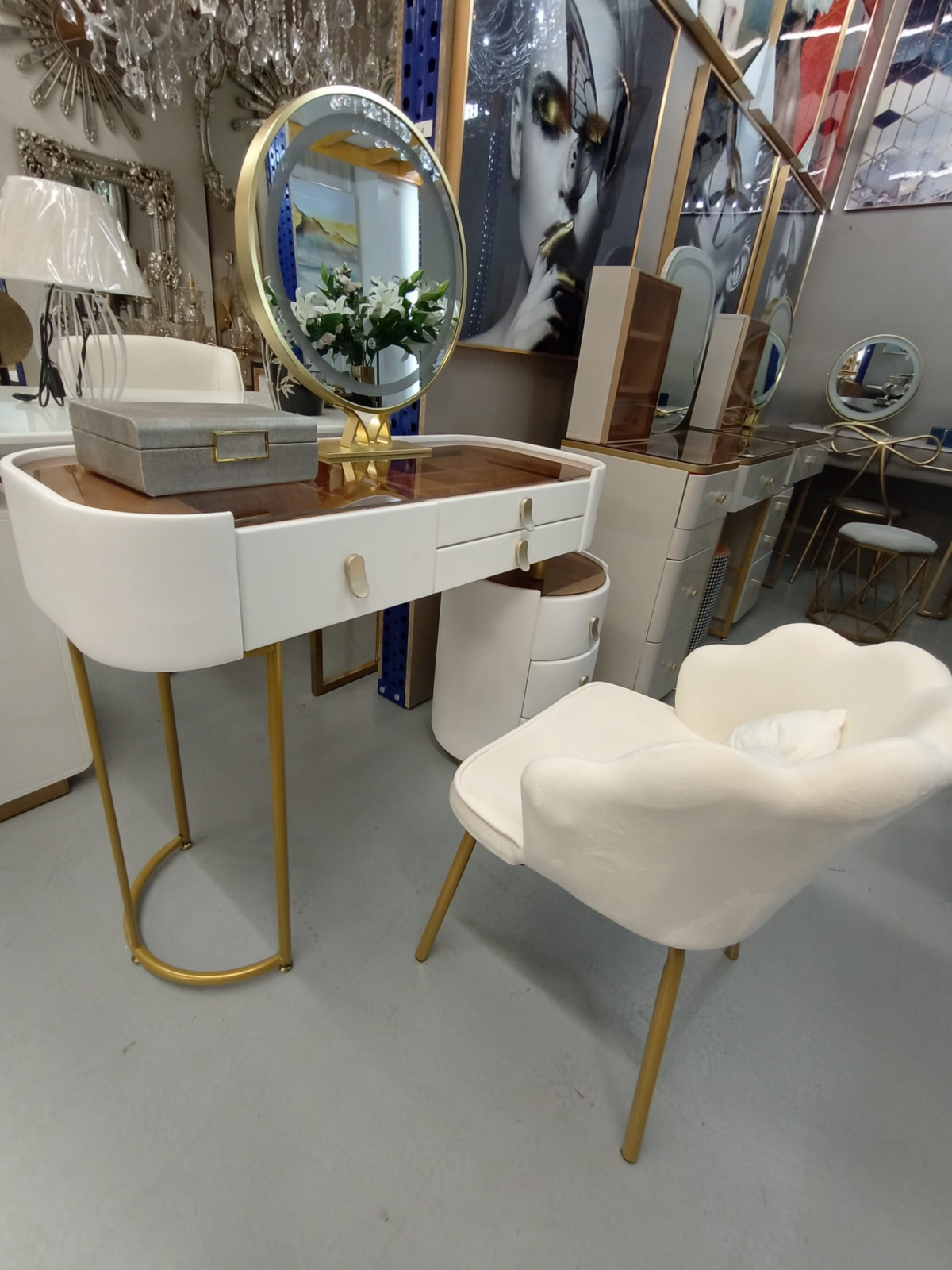 Comoda este confecționata din piele ecologică ,iar scaunul din catifea ce asigură confortul necesar în timpul machiajului sau pregătirii este inclus in pret.