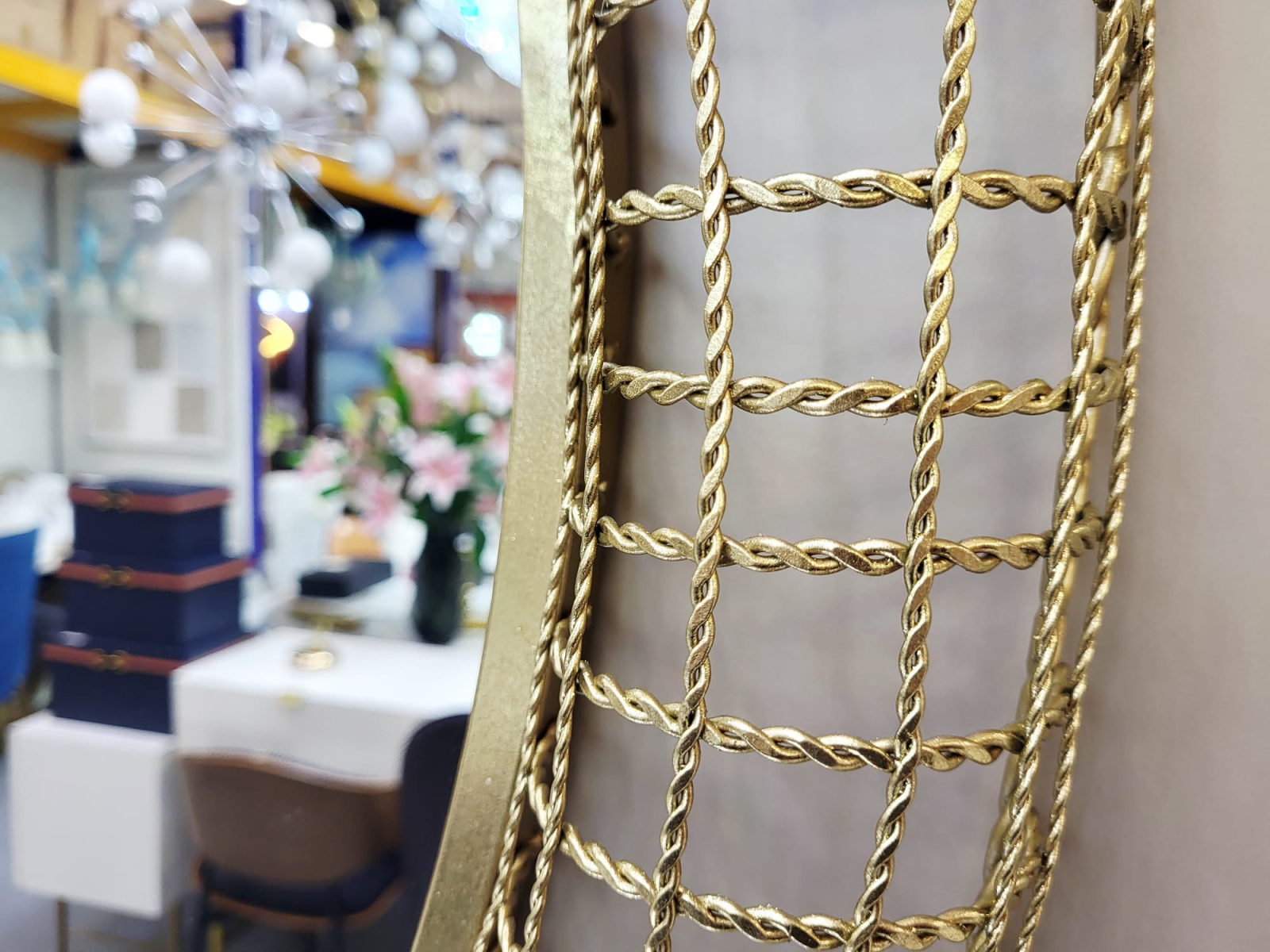 Oglinda decorativă model 95315 este o piesă de accent sofisticată, creată pentru a aduce eleganță, lumină și senzația de spațiu amplu în orice interior. Forma ovală clasică este pusă în valoare de o ramă spectaculoasă din metal auriu, cu design elaborat de tip plasă, care conferă oglinzii un stil glamour și rafinat.