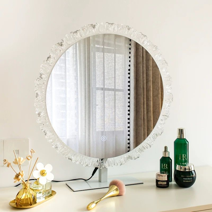 Realizată din acril de înaltă calitate și susținută de o bază metalică stabilă, oferă durabilitate și un aspect rafinat. Are un diametru de 53 cm, oferind o imagine clară și luminoasă, perfectă pentru aplicarea machiajului sau îngrijirea zilnică.