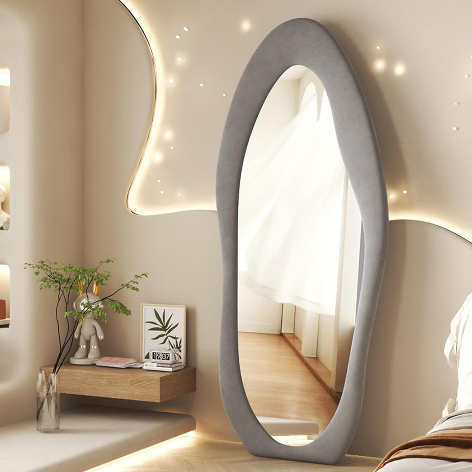 Oglinda RC170  este o piesă de mobilier modernă și elegantă, perfectă pentru a completa decorul din dormitor, dressing, salon și multe altele. Această oglindă se remarcă prin designul său unic, cu o formă ondulată și neregulată pe toată lungimea.Rama oglinzii este fabricată din MDF, umplută cu burete pentru un aspect sofisticat și confortabil. Suprafața ramei este acoperită cu catifea albă, adăugând un plus de rafinament și stil.