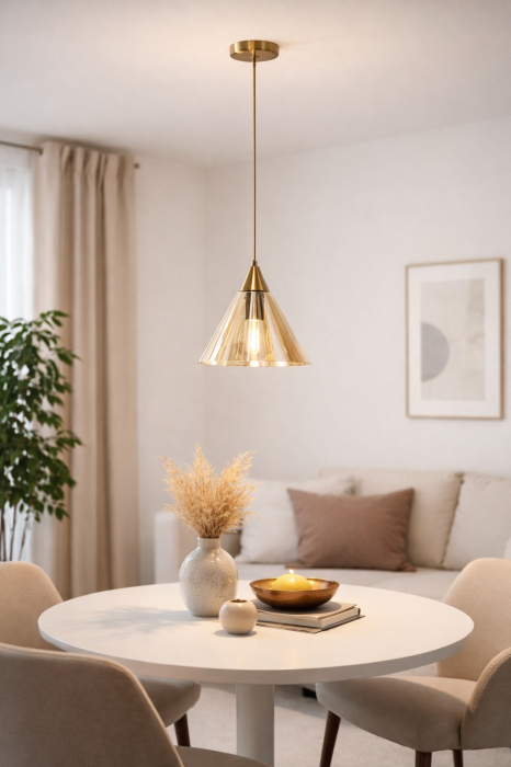 Pendulul model 7119/1D impresionează prin designul său modern și minimalist, fiind perfect pentru spațiile elegante și funcționale. Abajurul conic, realizat dintr-o combinație de metal cu finisaj auriu și sticlă, oferă un iluminat cald, focalizat, ideal deasupra insulelor de bucătărie, meselor de dining sau în cafenele.