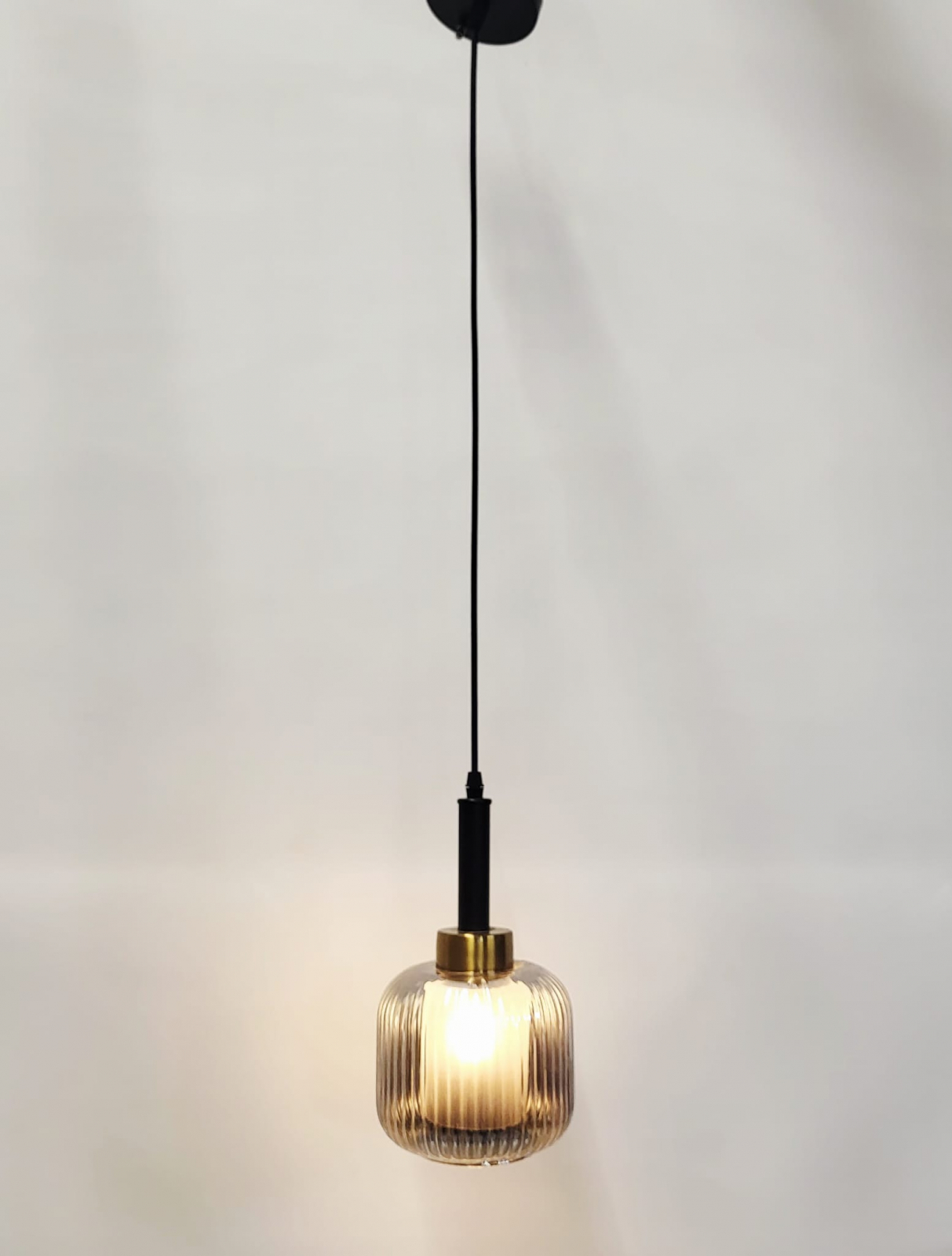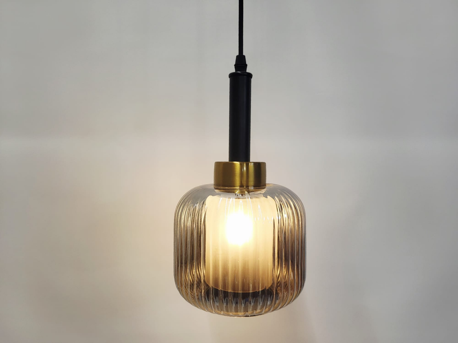 Pendulul 7027/1 SM este un corp de iluminat elegant și versatil, realizat din două globuri de sticlă suprapuse – unul interior alb mat, care difuzează uniform lumina, și unul exterior fumuriu cu detalii metalice aurii și negre, ce adaugă un aer rafinat și sofisticat.