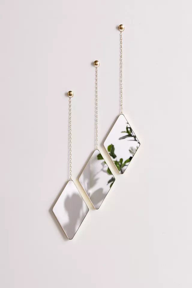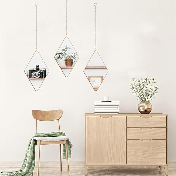 Setul de oglinzi decorative suspendate LX3 aduce un accent elegant și modern oricărui interior. Fiecare oglindă este realizată în formă de romb, având o ramă metalică subțire, finisată într-o nuanță aurie caldă, care oferă rafinament și luminozitate.