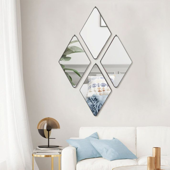 Setul de oglinzi decorative LX4 aduce un accent modern oricărui spațiu, datorită formei elegante de romb și ramei metalice subțiri, vopsite în argintiu . Fiecare piesă este concepută pentru a reflecta lumina într-un mod plăcut, creând senzația unui spațiu mai aerisit și mai luminos.