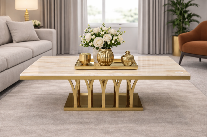 Masa de living 106 este o piesă de mobilier elegantă, concepută pentru interioare moderne sau luxoase. Designul său echilibrat combină un blat din compozit de marmură cu o bază solidă din metal auriu, rezultând o masă rafinată și durabilă.