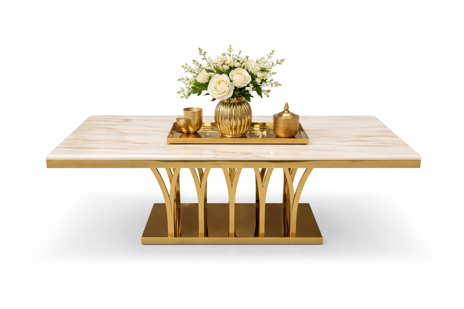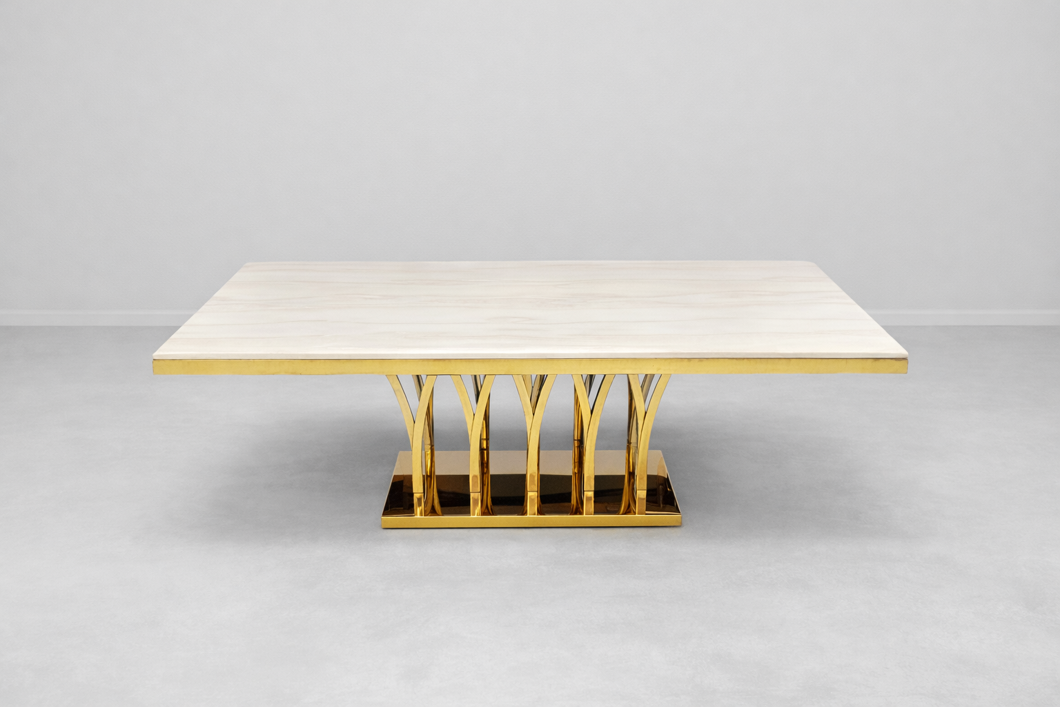 Baza metalică aurie are un design decorativ cu elemente arcuite care oferă stabilitate și susținere optimă mesei. Construcția robustă asigură o bună rezistență în timp, iar finisajul auriu adaugă un accent sofisticat întregului decor.