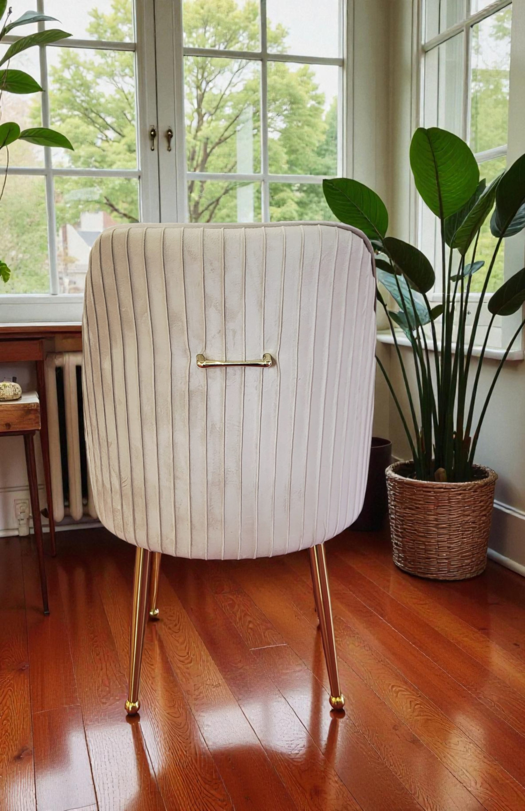 Scaunul S15 combină eleganța catifelei cu rafinamentul detaliilor aurii, fiind o alegere inspirată pentru spații moderne și sofisticate. Tapițeria moale din catifea bej conferă un aspect cald și plăcut la atingere, în timp ce picioarele metalice aurii adaugă o notă luxoasă și stabilitate excelentă.