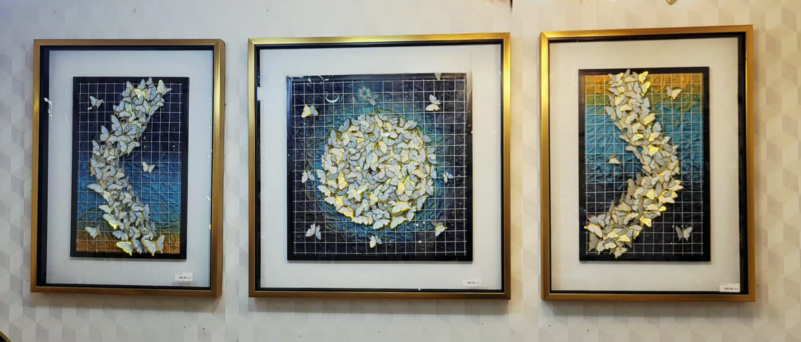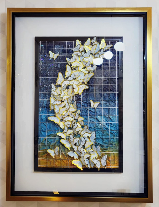 Elementele centrale sunt fluturii tridimensionali, atent poziționați, cu margini aurii ce captează lumina și creează reflexii subtile. Aceștia oferă tabloului un efect 3D autentic și un aspect viu, transformând piesa într-un punct de atracție vizuală.