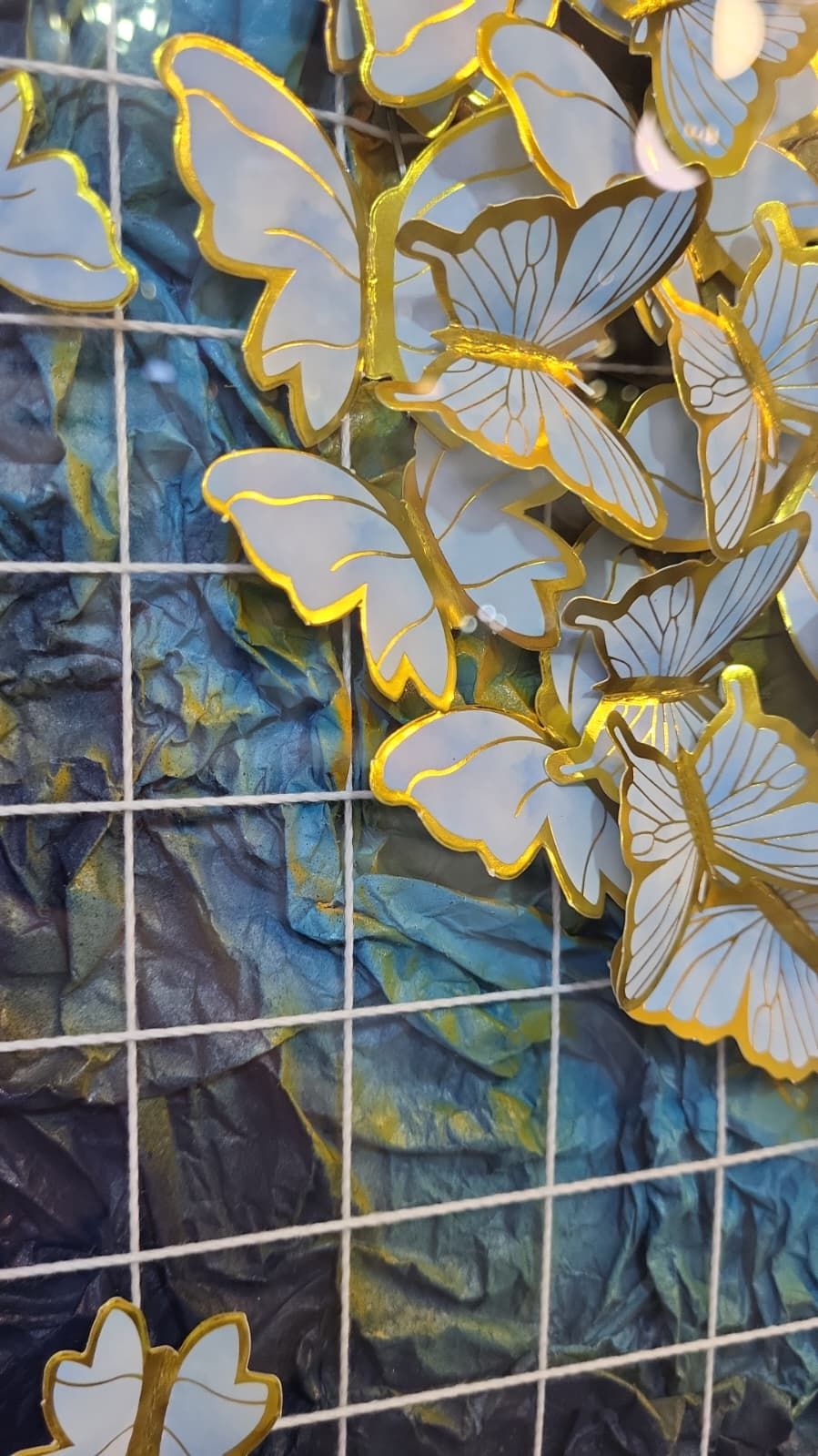 Tablou 3D cu fluturi cod 25203, fundal texturat albastru, grilaj decorativ din sfoară și ramă aurie, disponibil în trei variante.