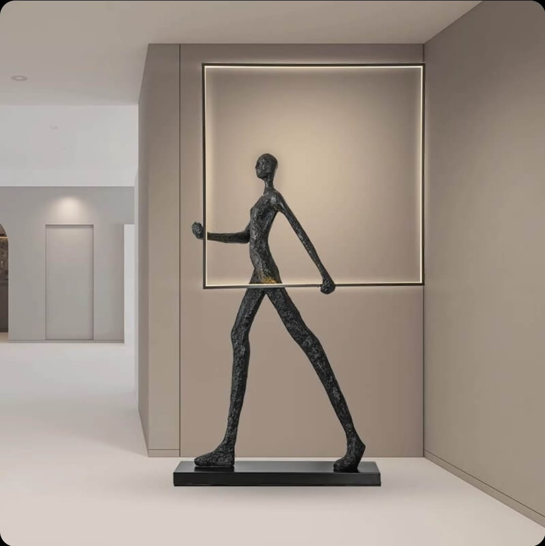 Lampadarul model F9105 este o piesă de iluminat decorativă cu design modern și expresiv, concepută pentru a aduce un accent artistic puternic în amenajările contemporane. Forma sa reprezintă o siluetă umană stilizată, realizată din rășină de culoare neagră, care susține o ramă pătrată cu iluminare LED integrată, creând un efect vizual elegant și bine definit.