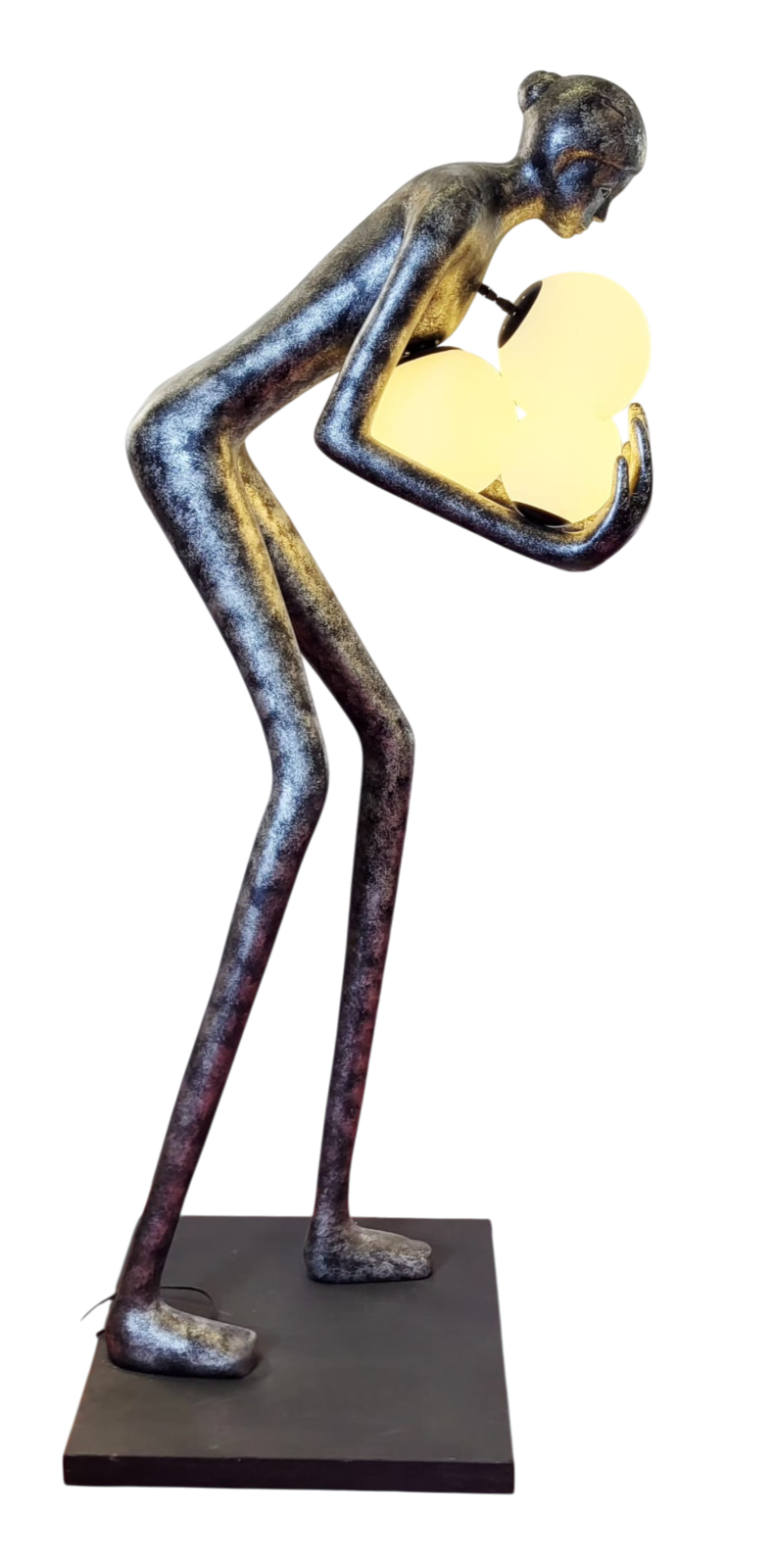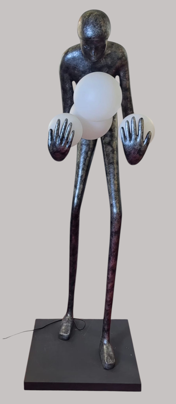 Statueta este realizată din fibră de sticlă, un material rezistent și durabil, finisat într-un amestec elegant de negru și argintiu patinat. Acest finisaj creează un efect metalic texturat, adăugând profunzime și caracter piesei. Cele patru globuri din sticlă opalină albă sunt integrate armonios în design și funcționează ca surse de lumină difuză, plăcută, ideală pentru ambient.